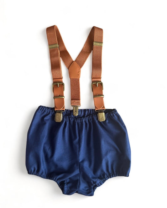 Baby Boy’s Navy Blue Bloomers and Brown Suspenders Birthday Outfit. Dark Blue Cake Smash Outfit. Baby Bloomers Suspenders Bow Tie Outfit