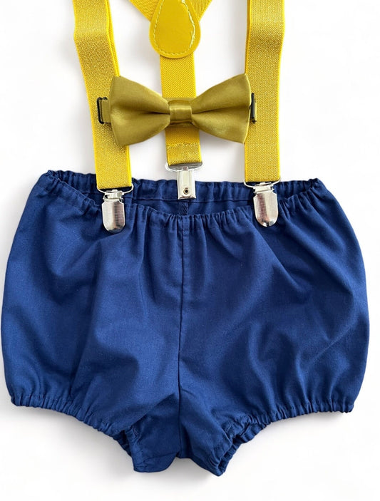 Baby’s Navy Blue Bloomers and Gold Glitter Suspenders Birthday Outfit. Dark Blue Cake Smash Outfit. Gold Glitter Suspenders and Bow tie